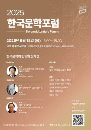2025 한국문학포럼이 18일 오후 3시 서울시 은평구 이호철 북콘서트홀에서 열린다.이번 토론회에서는 현재 문학계에서 활동하고 있는 교수, 시인, 평론가들이 ‘한국문학의 범위와 정체성’을 논의해 국립한국문학관의 전시 콘텐츠와 운영 방안을 모색한다.먼저 설성경 연세대 명예교수는 ‘전시모델로 제시하는 한국문학의 범위와 정체성’을 주제로 문학관이 구현해야 할 한국문학의 정체성을 발표하고, 장석주 시인은 ‘한국문학 작가의 신원과 정체성’을 주제로 한국 근현대문학사의 주요 작가와 작품을 일별하고 문학사의 흐름을 조망한다. 최진석 평론가는 ‘