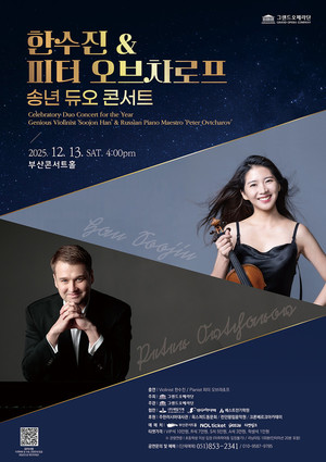 그랜드오페라단이 창단 30주년을 기념해 12월 13일 부산콘서트홀에서 2025 한수진 & 피터 오브차로프 송년 듀오 콘서트를 개최한다. 이번 공연은 바이올리니스트 한수진과 피아니스트 피터 오브차로프가 무대에 서면서 감사와 위로의 메시지를 전한다.두 연주자는 각자의 분야에서 천재로 불리는 거장이다. 바이올리니스트 한수진은 8세에 예후디 메뉴힌 학교에 입학하며 음악 신동으로 이름을 알렸다. 15세에는 비에니아프스키 국제 콩쿠르에서 역대 최연소 2위를 수상하고 특별상 7개를 휩쓸었다. 그녀는 1666년산 안토니오 스트라디바리우스로 연주한