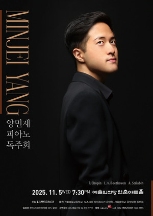 피아니스트 양민제의 독주회가 11월 5일 오후 7시 30분 예술의전당 인춘아트홀에서 개최된다. 이번 무대는 쇼팽, 베토벤, 스크리아빈의 주요 작품으로 구성됐으며, 고전에서 낭만, 그리고 러시아 피아니즘으로 펼쳐지는 피아노 예술의 흐름을 그려낸다.연주곡은 쇼팽의 ‘3 Waltzes, Op. 70’과 ‘3 Mazurkas, Op. 59’로 시작된다. 후기 작품 특유의 내면적 서정과 폴란드 민속 정서가 교차하며, 이어지는 ‘Polonaise-Fantaisie in A-flat Major, Op.61’에서는 자유로운 형식 안에서 감정의 격