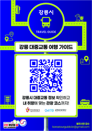 강원관광재단은 한국관광공사와 강릉을 방문하는 도보 관광객을 위한 강릉시 대중교통 관광 가이드 플랫폼을 공식 출시했다.강릉시 대중교통 관광 가이드 플랫폼은 대중교통을 이용하는 관광객을 대상으로 길 찾기, 테마별 추천 코스, 실시간 시내버스 정보, 시외ㆍ고속버스 및 KTX 열차시간 안내와 예약 등의 서비스를 일괄적으로 제공하는 대중교통 통합 안내 플랫폼 서비스이다.해당 플랫폼은 강릉역, 버스 터미널, 여행자 센터 등 주요 거점을 비롯해 아르떼 뮤지엄, 경포 아쿠아리움, 하슬라 아트월드 등 관광지와 음식점ㆍ카페등에 설치된 QR코드를 통해