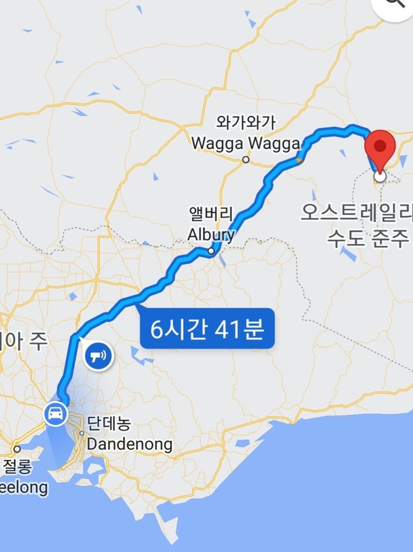 오늘은 캔버라로 이동하는 날이다. 여행을 준비할 때는 해안 길을 따라 시드니로 올라가는 여정을 계획했었지만, 그동안의 여정도 그렇고 앞으로 케언즈까지 가는 길이 대부분 해변 인근을 거슬러 올라가는 것이라서, 수도인 캔버라를 향해 방향을 수정했다. 대략 650㎞가 넘는 길이다. 세 명이 교대로 운전을 했고 도중에 앨버리(Albury)라는 도시에서 스시로 점심을 해결했다.