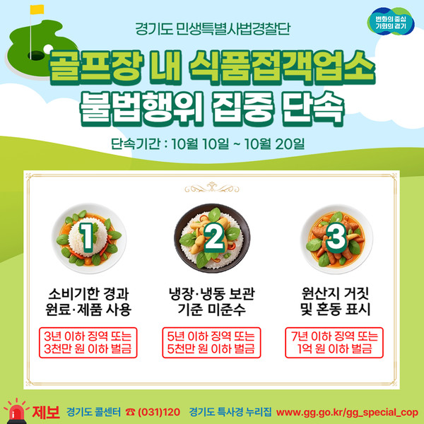 경기도 특별사법경찰단은 10월 10일부터 20일까지 화성시 등 경기도 12개 시군 골프장 내 클럽하우스 등 식품접객업소 150곳을 대상으로 불법행위를 집중 단속한다.